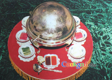 4、取一大地球仪盛器,盛器底部放上一小酒精炉,放上砂锅,盖上砂锅盖,盖上地球仪盖,放在一个小转台上,佐以洋葱、黄瓜条、甜酱上桌即成。