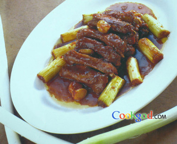 肉排斩成7厘米长的块状,腌渍上色,大葱改成6厘米长的条状,将排骨、大葱投入5成油锅中略炸,锅内下姜片、大葱、排骨煸炒,加二汤及调料烧开,移至小火上焖烧入味,勾芡,装盘即成。