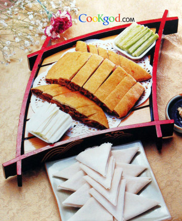 4、将炸好的鸭坯改刀摆马鞍形,上桌时带葱条、萝卜条、蒜蓉、甜面酱及倚叶饼各一碟。