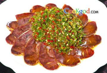 1、将牛腱肉加盐、葱、姜码味3小时,西芹洗净切成象牙块入沸水中汆熟捞出,青椒洗净后,用木炭火烧至颜色发黄,斩碎后放味精、酱油、香醋、熟色拉油调好味备用。