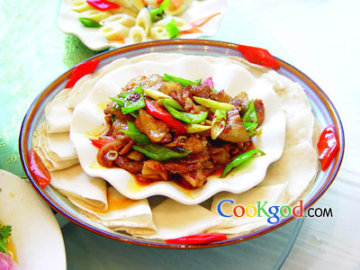 3、另起锅放入色拉油30克,烧至七成热时放入永川豆瓣、甜面酱小火煸炒1分钟,下青红辣椒片、蒜苗、猪肉大火翻炒2分钟至刚熟;下白糖、料酒、盐调味后出锅装入盘中,薄饼围于盘边,上桌后卷食即可。