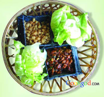 2、将球生菜叶完整剥离,整齐地排入竹篮中,将咸吐司切成0.5厘米见方的丁,入五成热油中小火炸至金黄酥香后,捞出沥油放入一个筒状盛器中。