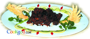 大青椒切块,洋葱切块,幼蛋面三个弄散弄成圆扁型面饼(如图三),热油锅倒满油在油冒烟后放蛋面饼进去油炸,大约两分钟后翻过另一边再炸两分钟捞出沥干油摆在碟上备用.排骨斩件洗净,豆豉泡水后搞烂,加红青椒切片,蒜茸,盐,糖,生抽,生粉,酒,麻油各调味料拌匀,腌二小时.大火水滚后放在蒸笼里蒸大约三十分钟即可拿出.热油锅,爆香蒜片,再放青椒块与洋葱块快炒,再放蒸过的豉椒排骨炒匀,放生粉水勾茨,再放一匙明油然后倒在炸面碟上即可出菜.