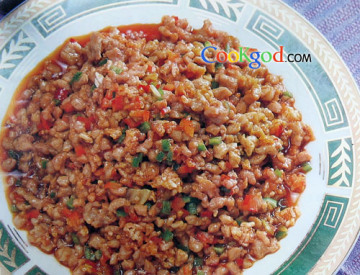 3、炒锅注油,下葱姜片、桂林辣酱炒香,加牛肉粒、糖、醋、盐炒匀,再放青红椒粒,炸脆的锅巴粒,翻匀出锅即成。