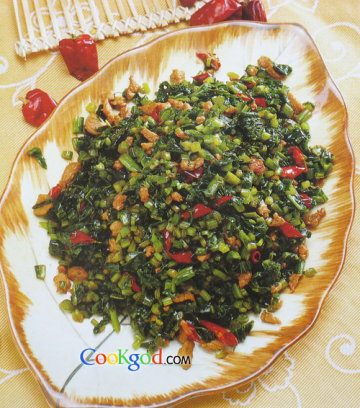 3、炒锅注油,下入干辣椒、肉末蒜末炒香,烹料酒,再放雪菜继续煸炒,加入酱油、糖、味精炒匀,淋香油,出锅即成。