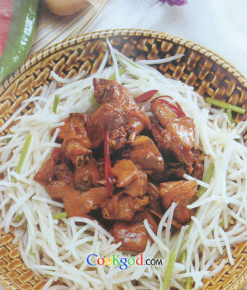 4、炒锅注油烧热,下葱姜片、干辣椒丝炒香,放入乳鸽,翻炒两分钟,烹料酒,加汤、糖、盐,烧至汤干,淋香油,装在银芽中间即可。