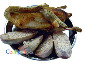 5、在焖制大孟鹅的同时,将粉芋洗净,削去外皮,切成厚2厘米、重约50克的大片,然后洗净,放入焖制大孟鹅的锅中同焖(这时大孟鹅约焖了40分钟),大约焖20分钟后出锅装盘即可。