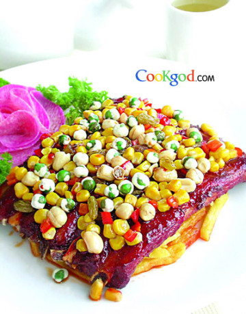5、锅加色拉油50克,烧至七成热时放入玉米粒、油炸夏果、去皮油炸花生米、葡萄干、胡萝卜丁、怪味豆大火翻炒,加入盐、味精、鸡粉炒均匀,出锅撒在仔排上即可。