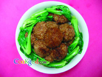 将肉团放入锅中加入高汤、老抽、猪油,大火烧开后慢火烧10-15分钟,加入油菜,放盐、味精、鸡精、胡椒粉、白糖略烧1-2分钟至青菜熟后出锅即可。