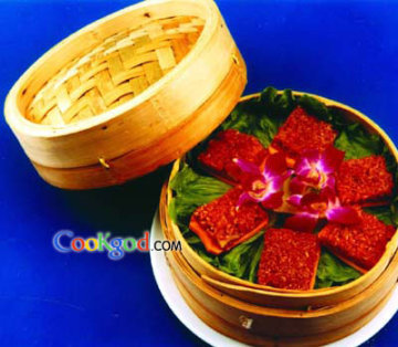 3、小笼铺上粽叶,放一层江米,排一层五花肉片,再铺一层江米,盖上盖大火蒸1.5小时,取出切长方块,装圆笼即成。