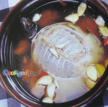 1、将甲鱼宰杀,初加工后洗净,焯水后放入沙锅中,加入清汤、姜、绍酒炖制l小时。