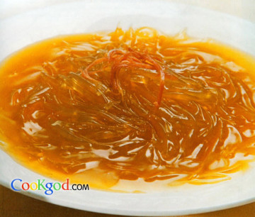 (3)起锅加上汤225g、精盐2g、味精1g,鸡粉2g烧开,用稳定生粉勾芡,撤胡椒粉离火。先盛一些芡汁在盘底,热烫的海虎翅过汁滤干放在上面,再浇芡汁在鱼翅上,撒火腿丝少许,与蒸热的菜胆盅一起上桌。