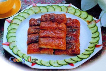 3.取出辣椒腌床中的肥肠后,刷上蜜蛇瓜汁,以碳火烤至微焦。