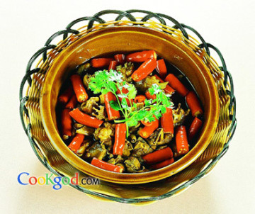 2、炒锅下底油烧至六成热,放入鸡块,旺火煸出香味后,下干椒粉、盐、味精、酱油、醋略翻炒,放高汤、尖红椒、豆豉小火焖煮15分钟,出锅撒香菜即可。
