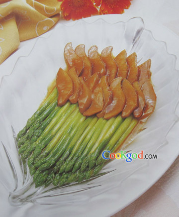 2、将煨好的百灵菇勾芡装盘,拼上已入味的芦笋,浇汁即成。