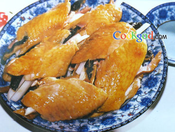 2、鸡翅按节剁成三段,翅尖不用。另两段去净骨,保持原形。净冬笋煮熟,同火腿、冬菇均切成丝。