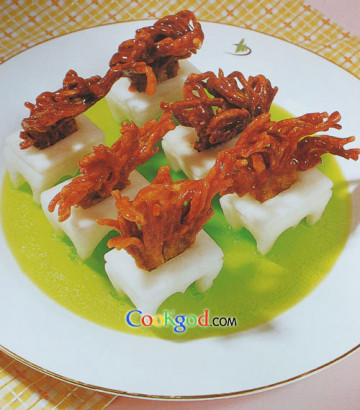 4、把腌好的肉片入油锅炸成珊瑚形,淋上用糖和白醋调好味的番茄酱,摆在底座上。