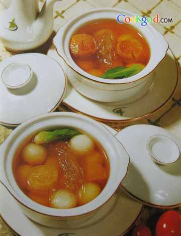 2、冬瓜挖球,火腿切片,放入盅内,盖上鱼翅,注入高汤,调味,炖透。