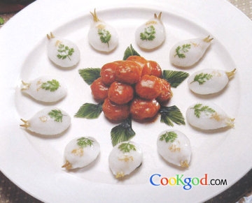 2、虾泥加入精盐、味精、葱姜末,拌匀上劲挤成丸子,入油中炸熟后取出,加入沙司、橙汁、白糖、醋、精盐,焖烧片刻,勾芡,逐个取出装于盘中即可。