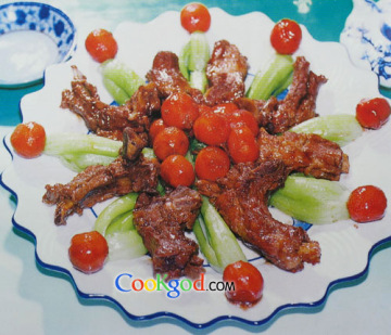 造型新颖,排骨香烂,菜质脆嫩,沙茶味浓。