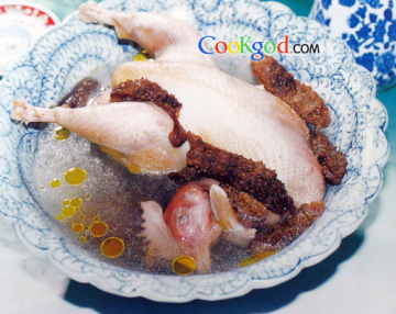 4、将刺参放在鸡的四周,加入清水、绍酒、精盐、葱结、姜片,加盖,用绵纸封严,入锅蒸2小时左右至熟烂取出,去掉葱、姜、加味精、淋入芝麻油即成。