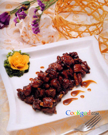 3、热锅下花生油,放入咖啡汁、番茄酱、冰糖、精盐、味精、高汤,烧沸后放入排骨,煨至熟透,勾芡装盘即可。