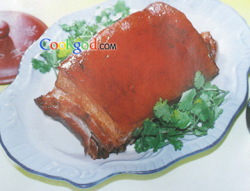 色泽红亮,肉断皮连,软烂香鲜。