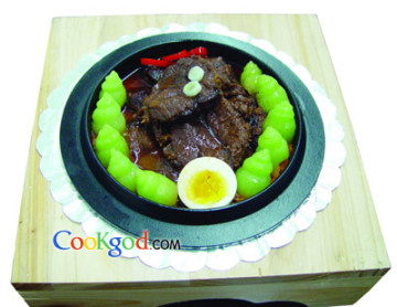 4浇入烧开的酱牛肉汤即可。