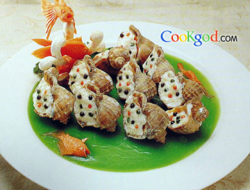 2、将泰国虾仁打成蓉,拌入角螺丁,调味后酿入角螺壳内。