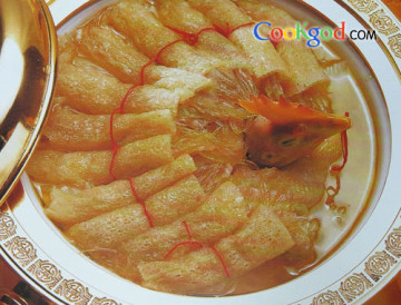 2、将竹笙洗净,分别将鱼翅酿入其中,分别摆在母鸡四周,注入顶级清汤,入蒸笼内蒸4个小时,调味即成。
