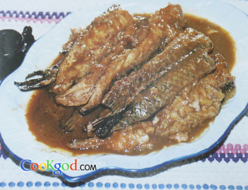 3.热油,下葱姜,加料酒、生抽、老抽、鸡精、盐、糖,加水调成汁,放入鱼尾,烧至汁水浓稠即可。