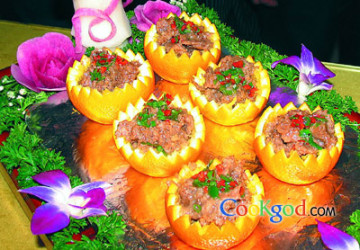 3、将处理好的牛肉上屉用大火蒸40分钟后盛入桔子盒中,再上屉大火蒸3分钟,放入盘中即可。