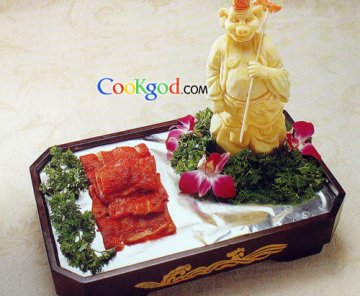 1、将猪颈肉洗净,改刀成片,用泸州老窖、花生酱、米酒、砂糖腌制入味,烤熟备用。