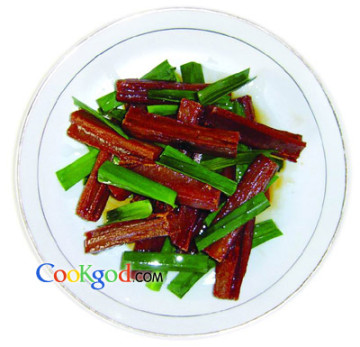 3、另起锅加入猪油烧至七成热,放入藕条,大火煸炒2.5分钟,放入青蒜段继续煸炒0.5分钟,淋入香油、葱油即可出锅装盘。