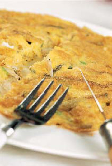 4.锅内放少许油,将拌好的料全部倒入锅里,盖上锅盖,用中火煎5 分钟左右,蛋液微呈凝固状时翻面煎熟即可。