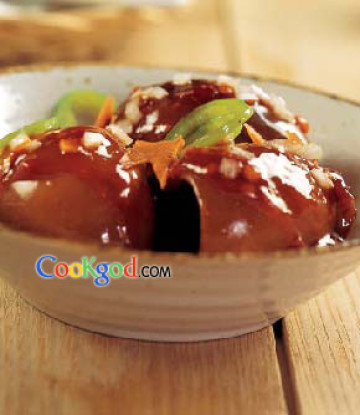 4.洋葱切末,另烧热少量油,将洋葱末炒至呈透明状,再加入辣椒酱、白糖及淀粉、水,调成浓稠状;