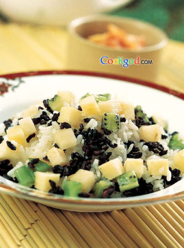 2.将泡好的米放入焖罐中,焖25~30分钟至熟。将水果丁、柠檬汁和米饭一起拌匀即可。
