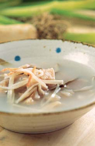 3.葱爆香,加清汤,连同蒸鱼的汁、笋丝、香菇丝、碎鱼肉入锅调味。