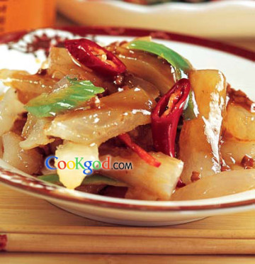 质地肥糯,酥辣可口。选购蹄筋时要仔细辨别,不要买到碱发的蹄筋,水发的蹄筋比较好。