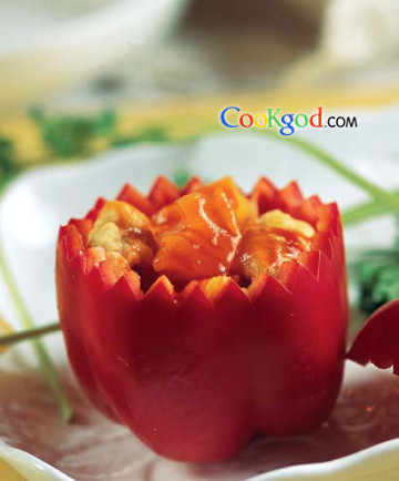 3.锅内留底油,炒香番茄酱,加入糖、香醋略炒,再放入辣椒片、菠萝片、洋葱片、炸好的肉块,加盐后炒匀即可。