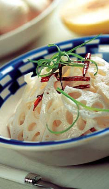 3. 将2 个干辣椒切丝后与葱丝一并放入藕盘内,再将醋、白糖调匀, 待糖溶化后浇在藕片上;