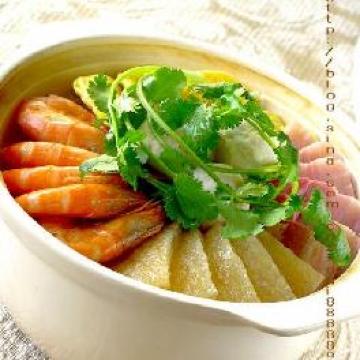 (食材可自行随意搭配),蛋饺,鱼圆,咸肉,大虾干,水发肉皮,大白菜,粉丝,盐,高汤
