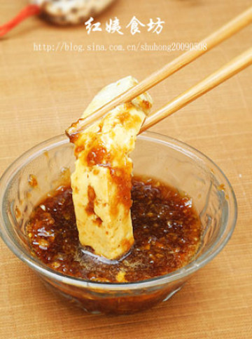 将鸡蛋清打入碗中,加湿淀粉搅拌成糊。将豆腐切成1.5厘米厚、25厘米宽、35厘米长的长方块,先挖槽灌上枣泥,再挂上蛋清淀粉糊,下油锅煎至金黄色取出。炒锅上火,放油烧热,用酱油炝锅,放一点水,加白糖、黄酒、花椒水,烧沸后放味精,用湿淀粉勾芡,浇在煎好的豆腐上即成。