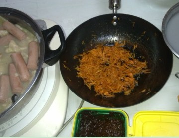 胡萝卜刮丝,热油、加盐糖、炒成我想要的状态,心情不好的时候也可以加点鸡蛋、火腿、木耳之类,在家妈爱放芫荽,这里木有
