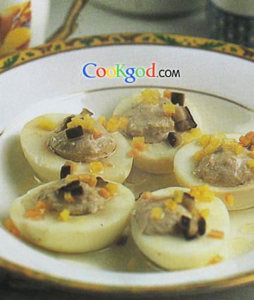 1.将鸡蛋煮熟,一切为二,蛋黄取出,备用。