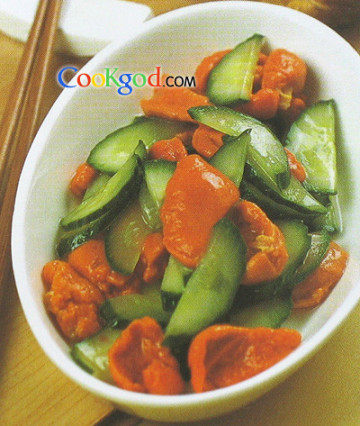 夏贝黄300克,黄瓜100克,葱花少许。调料精盐1小匙,味精1/2小匙,糖1/2小匙,料酒适量,色拉油2大匙。