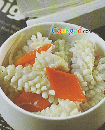 1、鲜鱿鱼撕净套膜,摘下头脑、内脏,治净后去角质内壳,在体内剞花刀后切片,下清汤中汆至入味捞出;