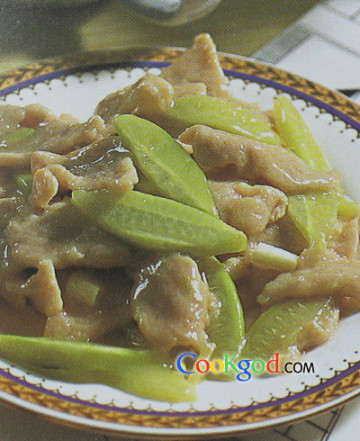 3.锅中留油30克,爆香葱段后将葱段夹出,黄瓜倒入锅略加煸炒1分钟左右,加入肉片同炒,最后以生粉水20克(生粉10克加水)勾芡,即可盛盘供食。