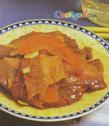 3、牛肉片下入六成热油中,滑散滑透,倒入漏勺;原锅留少许底油,用葱、姜、蒜炝锅,放入胡萝卜片煸炒,烹绍酒,再放入牛肉片,倒入对好的芡汁,翻炒均匀,淋花椒油,出锅装盘即可。