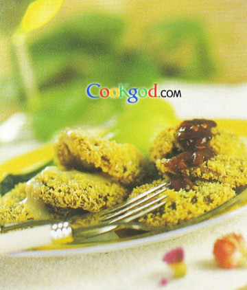 鲜香菇300克,鸡蛋2个,油菜2棵,鸡蛋2个,面包糠适量。调料千岛酱,辣酱2大匙,生粉100克,色拉油适量。